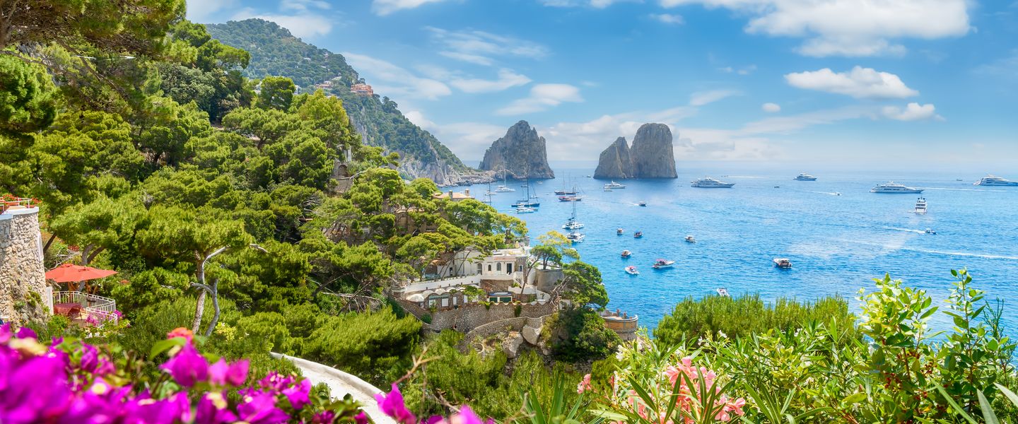 Capri liegt im Tyrrhenischen Meer, etwa 5 Kilometer von der italienischen Küste entfernt und ist Teil der Region Kampanien. Die Insel hat eine Fläche von etwa 10,4 Quadratkilometern und ist von steilen Klippen und malerischen Buchten umgeben. Capri ist gut mit Fähren und Schnellbooten von Neapel, Sorrent und anderen Küstenorten erreichbar, was es zu einem beliebten Ziel für Tagesausflüge und Kurzurlaube macht. Die geografische Lage macht Capri auch zu einem idealen Ausgangspunkt für Erkundungen der umliegenden Inseln, wie Ischia und Procida, sowie der beeindruckenden Amalfiküste. Die Kombination aus der spektakulären Landschaft, der reichen Geschichte und der luxuriösen Atmosphäre macht Capri zu einem unvergesslichen Erlebnis für alle, die die Schönheit und den Charme dieser einzigartigen Insel entdecken möchten.