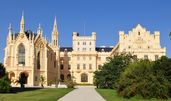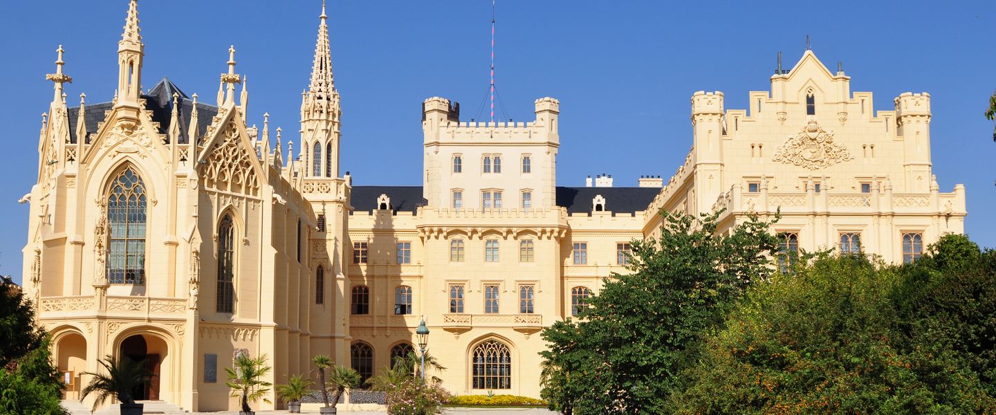 Schloss Lednice liegt im südlichen Teil der Tschechischen Republik, in der Region Südmähren, nahe der Stadt Lednice. Geografisch befindet sich das Schloss in der Nähe der Grenze zu Österreich und ist von einer malerischen Landschaft aus Weinbergen und sanften Hügeln umgeben. Die Region ist bekannt für ihre Weinkultur und die idyllische Natur, die zahlreiche Möglichkeiten für Outdoor-Aktivitäten bietet. Lednice ist gut mit dem Auto und öffentlichen Verkehrsmitteln erreichbar, und die Nähe zu anderen historischen Städten wie Mikulov und Znojmo macht das Schloss zu einem idealen Ziel für Tagesausflüge. Die Kombination aus beeindruckender Architektur, reicher Geschichte und der Schönheit der Umgebung macht Schloss Lednice zu einem unvergesslichen Erlebnis für alle, die die kulturellen Schätze der Tschechischen Republik entdecken möchten.