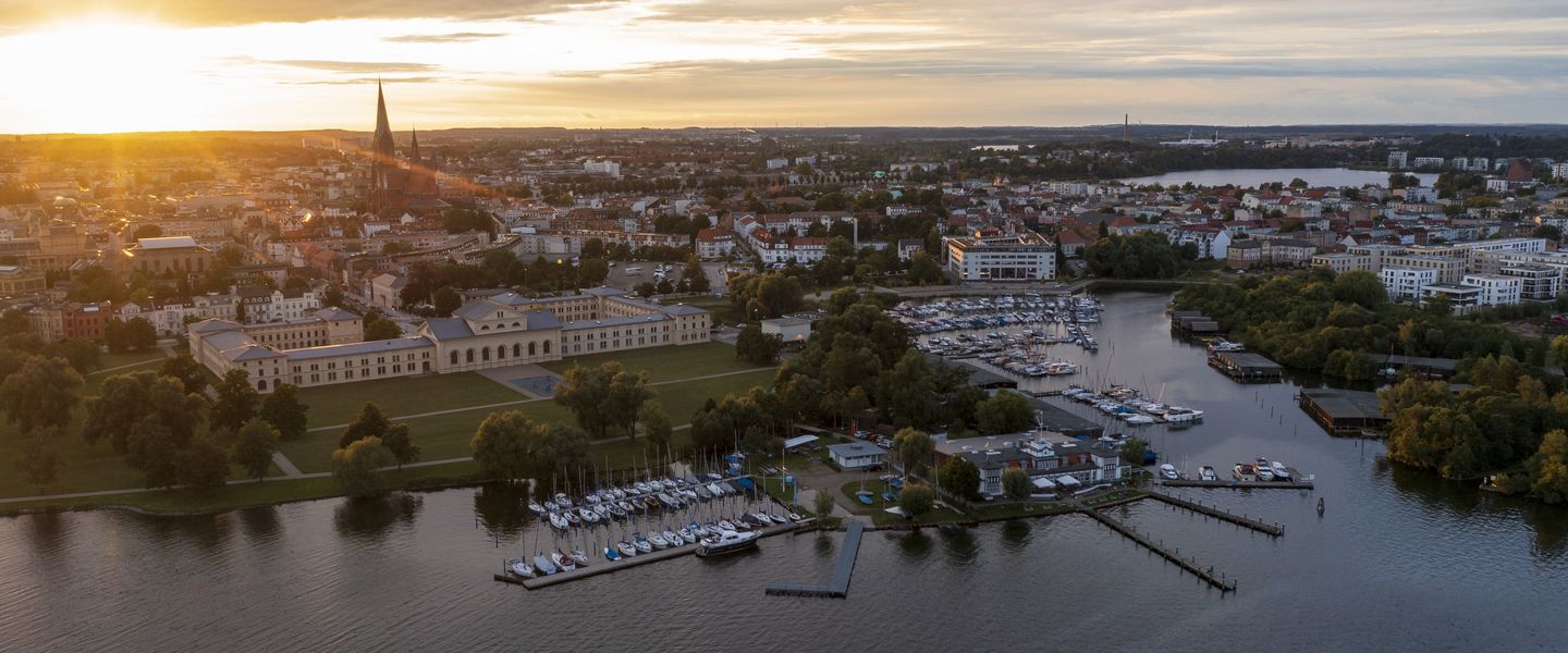 Seit ihrer Gründung durch Heinrich den Löwen ist die älteste Stadt Mecklenburgs immer der Mittelpunkt dieses Landes gewesen. Eingebettet in eine idyllische Wasserlandschaft, wird die Stadt seit jeher von den blauen Seen dominiert, die ein Viertel der Stadtfläche einnehmen. Das imposante Schloss "schwimmt" mitten im Schweriner See und erhebt sich märchenhaft, anmutig und filigran aus Deutschlands viertgrößtem See, stolz und voller Würde.