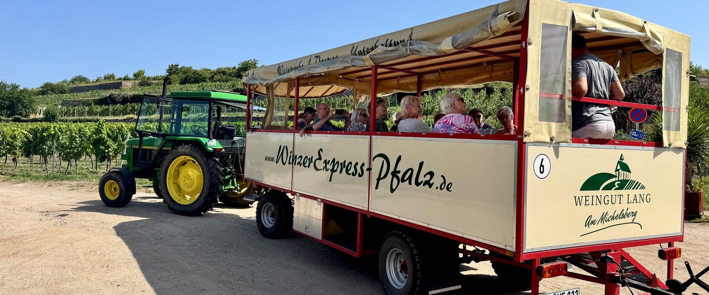 Mit dem Winzer Express geht es auf eine rund zweistündige Planwagenfahrt durch die malerischen Weinberge der Pfalz. Während der Fahrt erleben wir die herrliche Landschaft, erfahren Wissenswertes über den Weinbau und genießen die typisch pfälzische Lebensart sowie eine 4er Weinprobe.